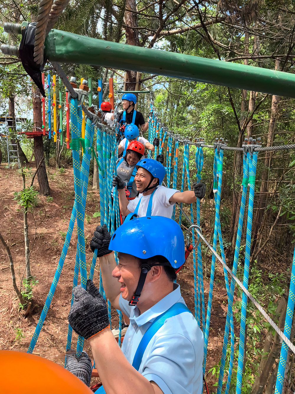 富有挑战性的拓展项目化身团队协作催化剂:丛林穿越挑战自我,同事们相互扶持共同克服难关;玻璃栈道上俯瞰美景,既惊险又赏心悦目,大家互相鼓励勇敢前行,享受视觉盛宴。保险缆串联起信任纽带,同事的鼓励使颤抖的脚步变得坚定。这场“自然课堂”生动诠释了金塘人的团队精神:既能共攀事业高峰,亦能笑对各种挑战。